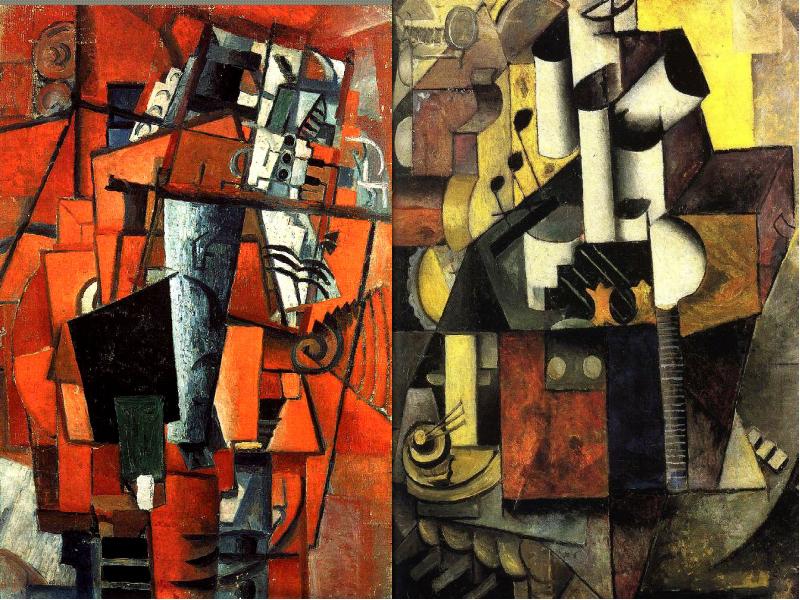 Малевич соединял различные стили в своих работах. И хотя жил в бедности, вместо холстов он использовал то, что находилось в его доме. Например, на полках этажерки он написал три работы: «Туалетная шкатулка», «Станция без остановки» и «Корова и скрипка». Малевич даже работал над созданием оперы «Победа над Солнцем» — придумал декорации, эскизы костюмов и освещение.