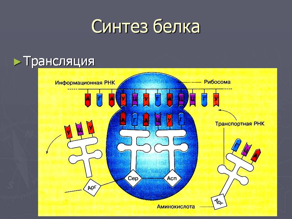 - инициация (рибосома определяет стартовый кодон, начинается синтез);