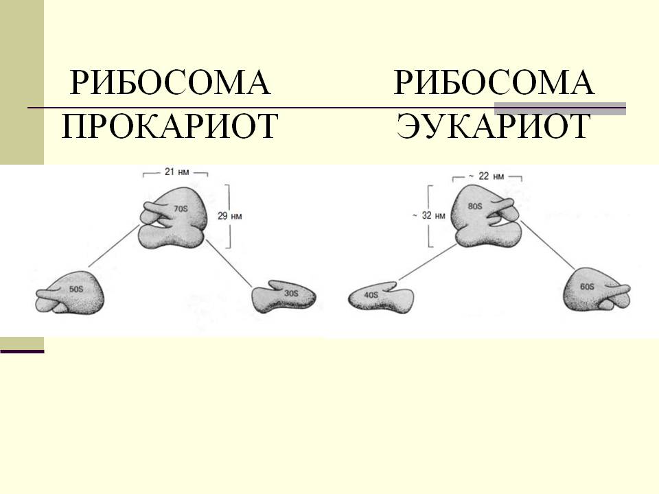 Описываемые образования разделены на 2 типа, отличающиеся функциями и строением — прокариотические и эукариотические. Первые из них присутствуют в клетках зеленых водорослей и бактерий, которые принято называть 70S.