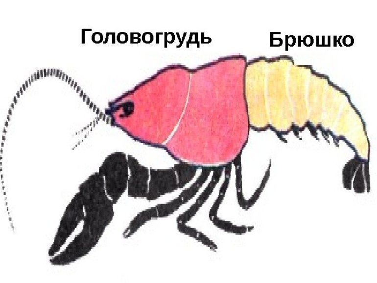 У каждого членистоногого тело состоит из отдельных сегментов. Большинство видов имеют брюшко, грудь и голову. Но отделы могут сливаться в пределах одной части. Например, строение ракообразных включает в себя брюшко и головогрудь, которая образовалась из-за слияния груди и головы. Всё зависит от конкретного класса и разновидности. У всех представителей на голове присутствуют усики и антеннулы.