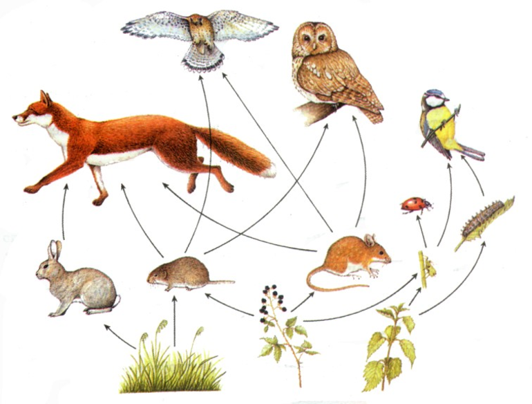 Цепи выедания характерны не только для наземно-воздушной среды, но и для водоёмов: водоросли — головастики — карпы — цапли.