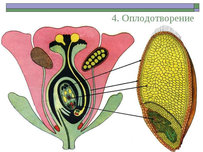 В зрелом женском гаметофите содержатся 7 клеток. Если гаметы созрели, наступает естественное либо искусственное опыление. В результате пыльцевое зерно переносится на пестик. Явление протекает по следующим схемам: