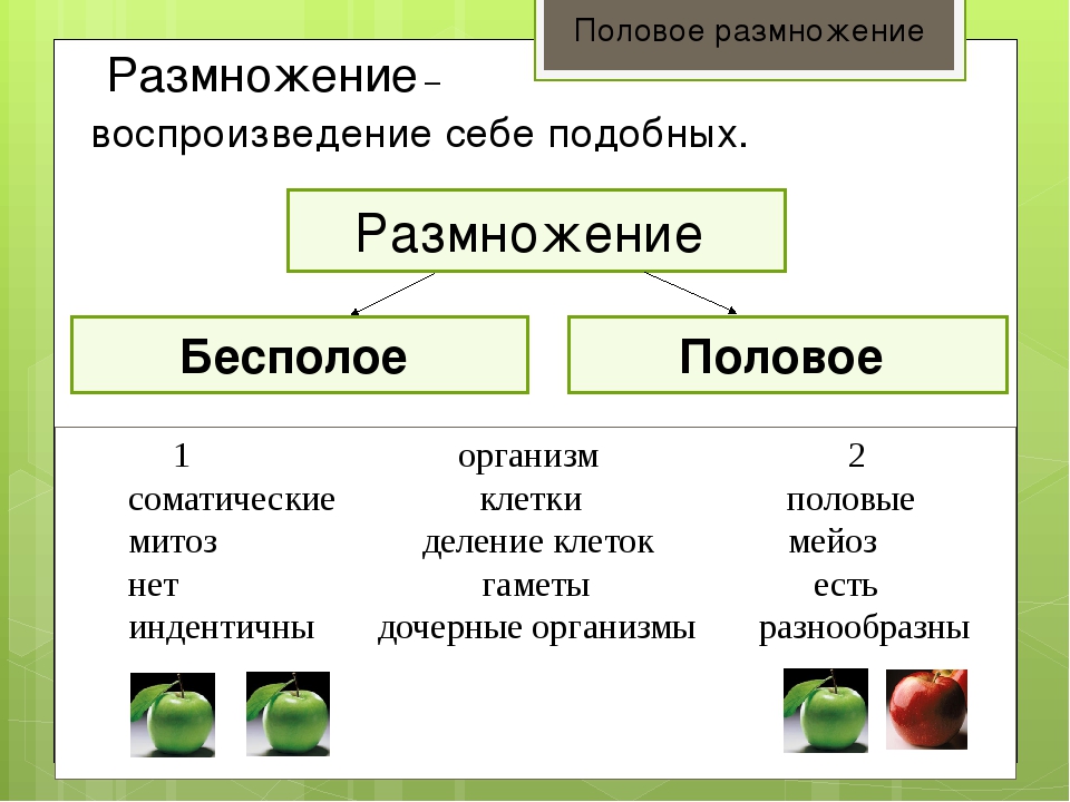 Таким образом, под размножением растительных организмов понимают совокупность процессов, увеличивающих число особей в популяции определенного вида. Подразделяется на генеративное, включающее половое и бесполое, и вегетативное воспроизведение.