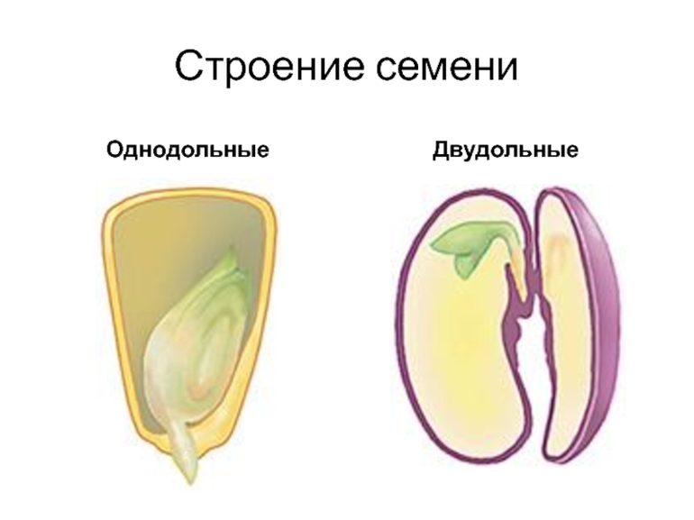 Строение семени, цветка и плода однодольных и двудольных растений включает эндосперм, зародыш и кожуру. Основная часть состоит из корешка, стебелька, почечки и семядолей, которые после прорастания превращаются в первые эмбриональные листья саженца. Такой способ размножения и расселения называется генеративным. У класса покрытосеменных семязачатки образуются внутри питательной оболочки.