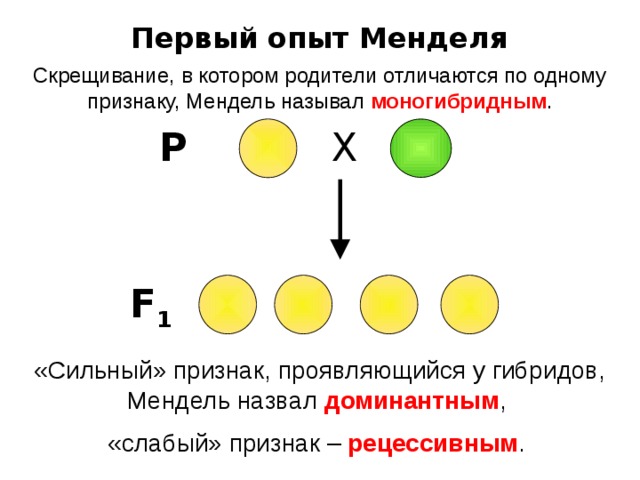 Форма признака, которая проявлялась у следующих поколений, у Менделя получила название доминирующей. Для проведения опыта учёный использовал семь пар растений, и в каждой из них проявлялись доминантные и рецессивные гены.