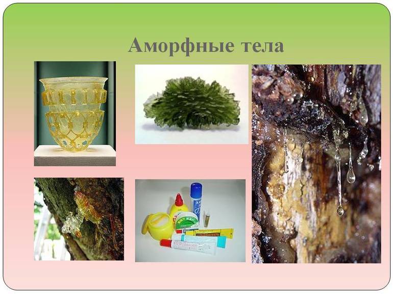 К аморфным телам можно отнести множество веществ, которые активно используются человечеством. Например: пластмассы, стекло, парафин, каучук, эбонит.