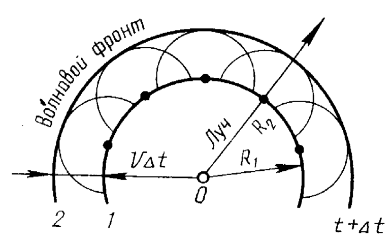 Объяснить принцип можно следующим образом. Легко представить, что имеется источник света. Фронт волны прошёл некое расстояние, при этом граница излучения имеет сферическую форму. Его можно разбить на источники отражений. Такая ситуация будет для момента времени, при котором t = t0. Через некоторое время Δt волна пройдёт расстояние: d = с * Δt. При этом каждый точечный источник имеет свой сферический фронт, создающий отражения.