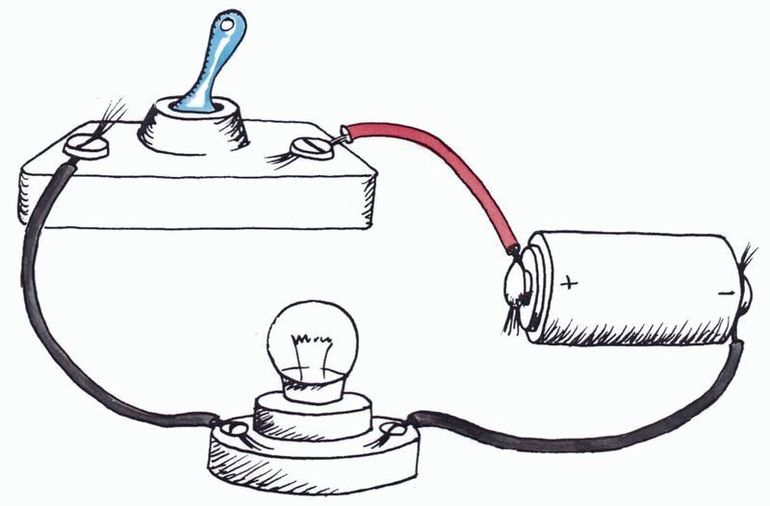 Сборка конструкции выполняют следующим образом. К плюсу батарейки подсоединяют провод, подключённый другим концом к выключателю. Затем свободный конец ключа подпаивают к любому из выводов лампы. Другой электрод осветительного устройства подсоединяют к минусу источника. Схема готова. Если теперь перевести ключ в положение «вкл» появится свет.