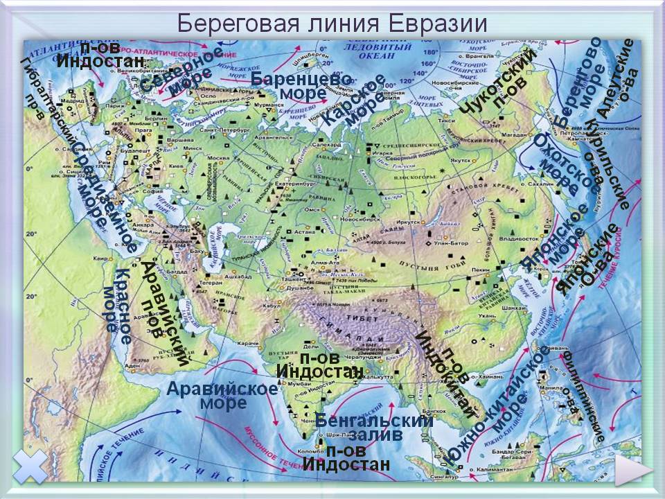 Еще со школы начинают изучать географию других территорий, в том числе береговую линию Евразии, а также моря и океаны, омывающие самый огромный континент на карте Земли. Количество водоемов поистине поражает, поскольку материк имеет границы не только с теплыми водами (Индийский океан), но и холодными течениями (Северный Ледовитый). Акватории оказывают сильное влияние и на климатические условия.