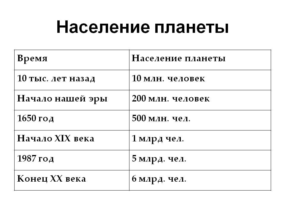 В докладе или сообщении следует отметить, что 2000 лет назад на планете проживало около 170 млн людей. Спустя 1000 лет это число уже достигло 250 млн, то есть за тысячелетие количество представителей homo sapiens возросло лишь на 80 млн, что можно считать незначительной цифрой, в сравнении с современной скоростью роста, которая превышает указанную цифру за один год.