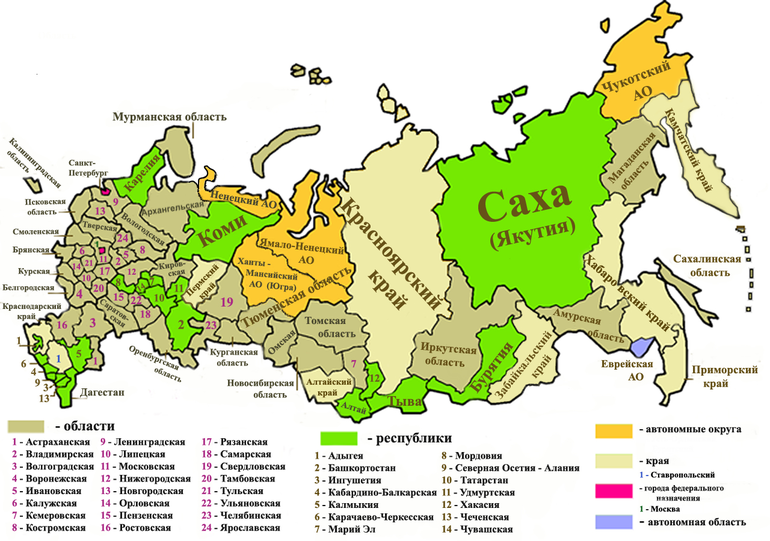 Согласно Конституции, изменённой после присоединения Крыма, в состав Российской Федерации входят 22 республики, 9 краёв, 46 областей, 2 города федерального значения, 1 автономная область и 4 автономных округа (АО).