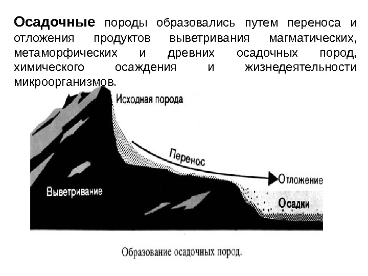 - При выветривании магматических, метаморфических или более древних осадочных формирований образуются обломки, растворы и даже новые минералы. С этого процесса начинается образование осадочного слоя, его называют гипергенезом, а порода, из которой складывается новая — материнской.