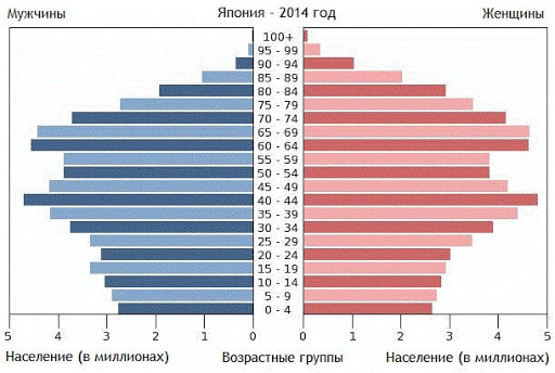 Эти показатели позволяют сказать, что японцы — самый старый народ на планете. Почти четверть населения составляют пенсионеры. Но проблема заключается в том, что детей и подростков всего 13%. Остальные люди находятся в трудоспособном возрасте. Соотношение мужчин и женщин в зависимости от возрастной категории: