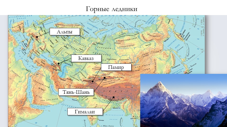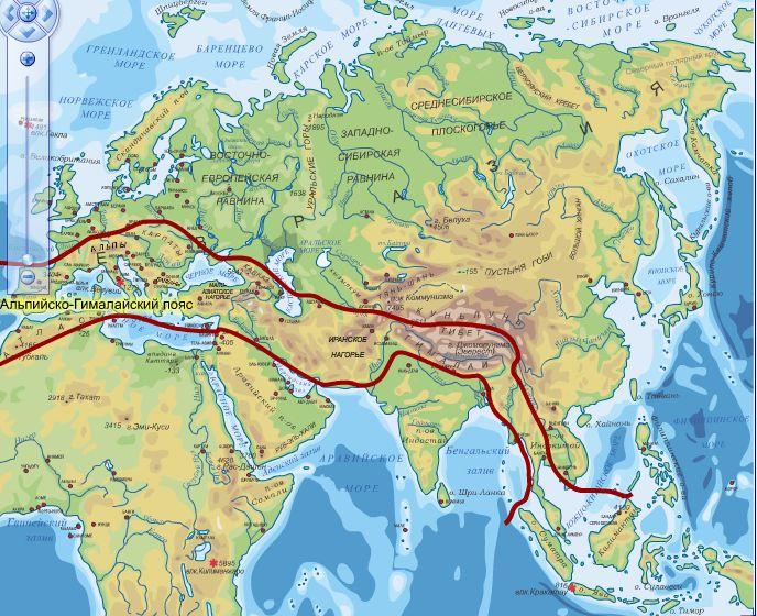 Для первых характерна большая высота, значительная амплитуда высот, острые пики, крутые склоны и сильно расчлененный рельеф. Молодые горы Евразии на карте представлены грядой Гималаев, Альп, Пиренеев, гор Кавказа и Тибета. Они возникли менее 50 млн лет назад и продолжают расти.