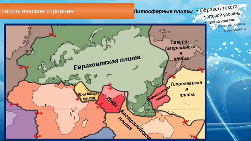 Складчатость сформирована двумя обширными поясами — Альпийско-Гималайским и Тихоокеанским.