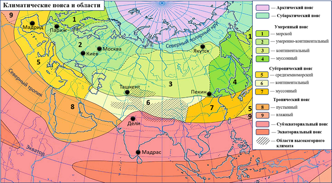 Со стороны окружающих океанов на сушу поступают влажные муссоны и лишь Северный Ледовитый океан приносит холод арктических пустынь, где преобладают низкие температуры. Колоссальные размеры континента позволяют вмещать в себя все климатические пояса и присущие им погодные условия.