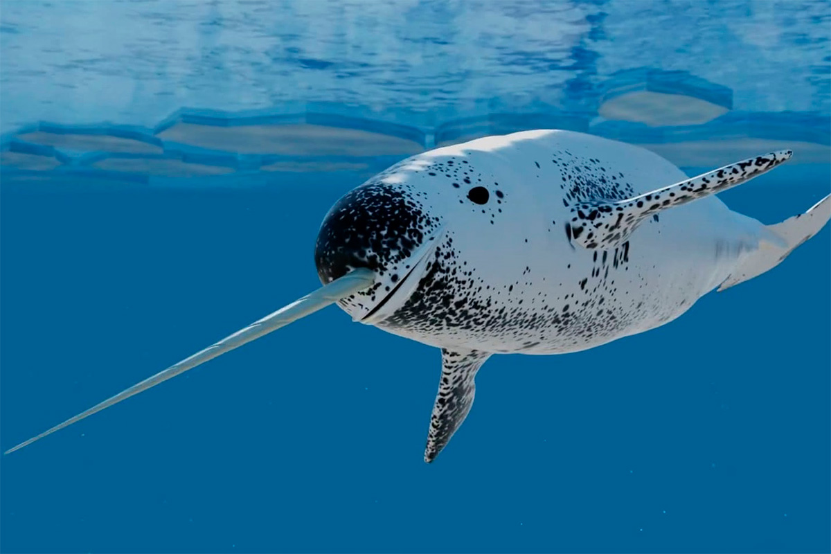 Интереснейшее морское животное — нарвал. Он узнается по длинному (до 3 м) спиралевидному бивню, расположенному в передней части головы. На самом деле это разросшийся в длину передний зуб, но за схожесть его еще называют морским единорогом. Этот редчайший кит в мире (всего около 40 тыс.) живет небольшими группами по 6−10 особей, сбиваясь в большие стада только во время миграции.