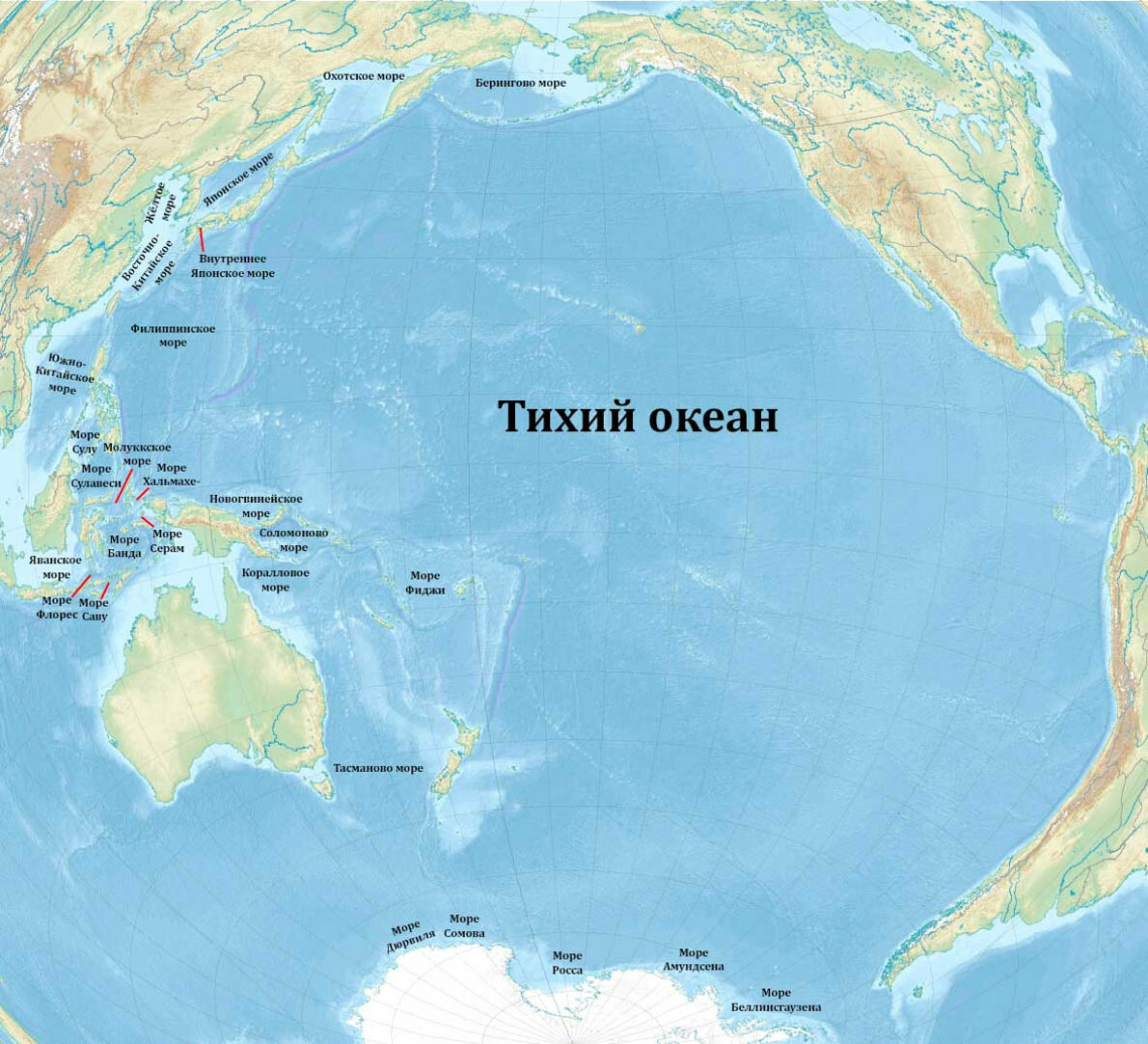 Большинство краевых морей в бассейне Тихого океана располагаются вдоль азиатского побережья. Малайский архипелаг содержит множество межостровных морей.