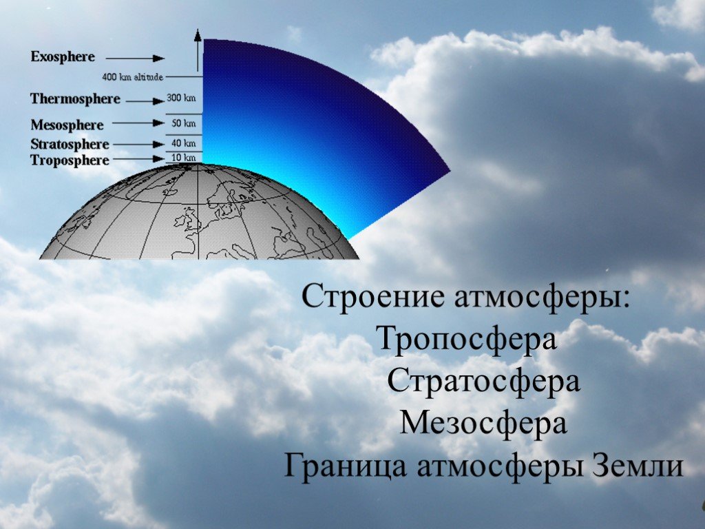 Оболочка разделена несколькими слоями, находящимися во взаимосвязи между собой. Тропосфера занимает от 8 до 12 км, отвечает за климатические условия, осадки, перемещение воздушных масс, содержит в большом количестве водяной пар. Стратосфера по высоте находится в пределах от 12 до 55 км, состоит из большого количества озона, защищает живые организмы планеты от ультрафиолета.