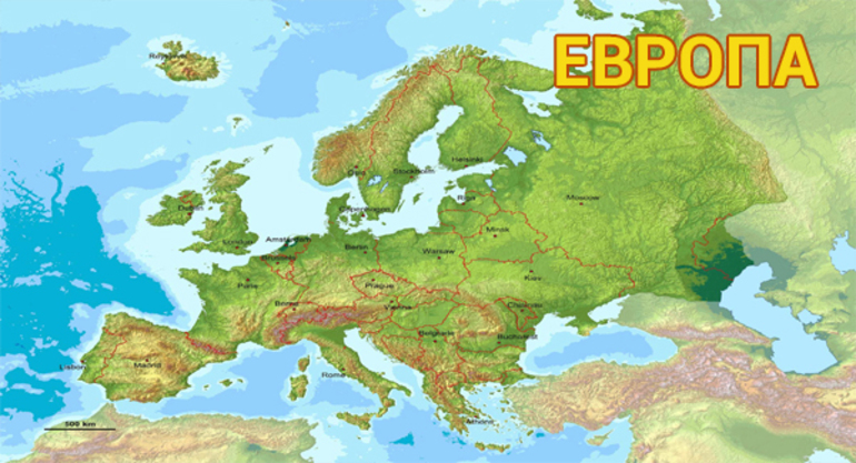 В географическом плане Европа представляет собой восточную часть евразийского материка, 81% площади которого относится к Азии. Протяжённость Европы с севера на юг составляет около 5 тыс. км и около 3 тыс. км с востока на запад. Около 80% ландшафта занимают равнины и возвышенности, чередующиеся с горными массивами — Скандинавским, Альпийским, Карпатским, Балканским, Апеннинским и Пиренейским. Берега Европы омываются водами Северного Ледовитого и Атлантического океанов и относящихся к их бассейнам морей.