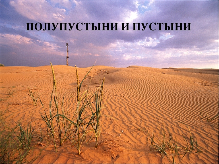 Природные зоны пустыня и полупустыня отличаются засухой, обедненным растительным и животным миром. Они присутствуют практически во всех климатических поясах, характеризуются незначительным количеством осадков, до 150 мм весной. Наблюдается резкий температурный перепад на протяжении суток и в течение года. Климат является сухим и жарким, при этом влага не успевает впитываться в грунт и быстро испаряется.