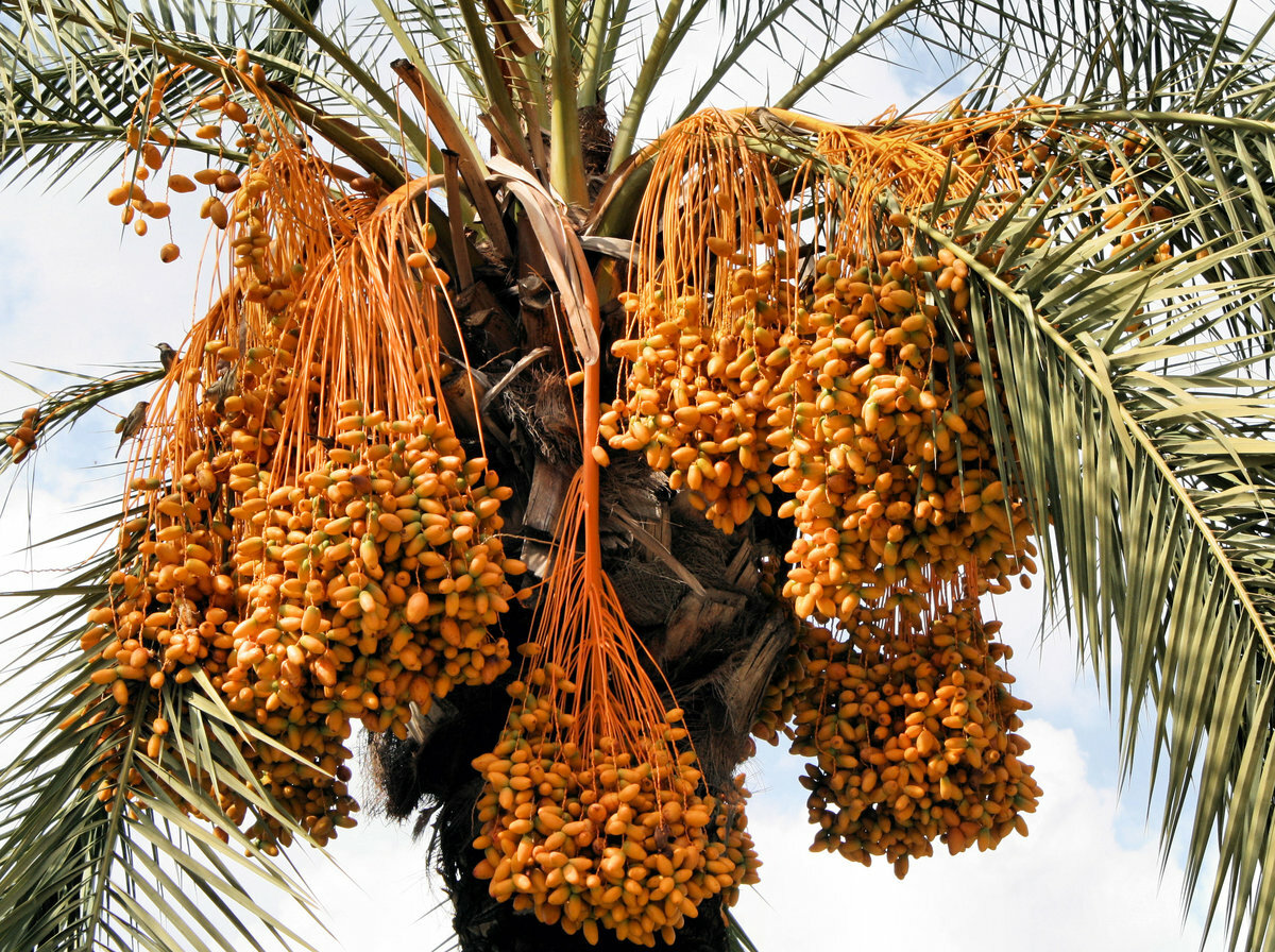 - Финик пальчатый. Типичный представитель пустынного ландшафта из семейства пальмовых. Это крупное высокое растение, на верхушке которого образуется крона из огромных перисто-раздельных листьев. Желто-оранжевые бутоны превращаются в метельчатые соцветия длиной до нескольких метров. Каждое дерево дает в год до 20 кистей с финиками — продолговатыми ягодами с вкусной сладкой мякотью.