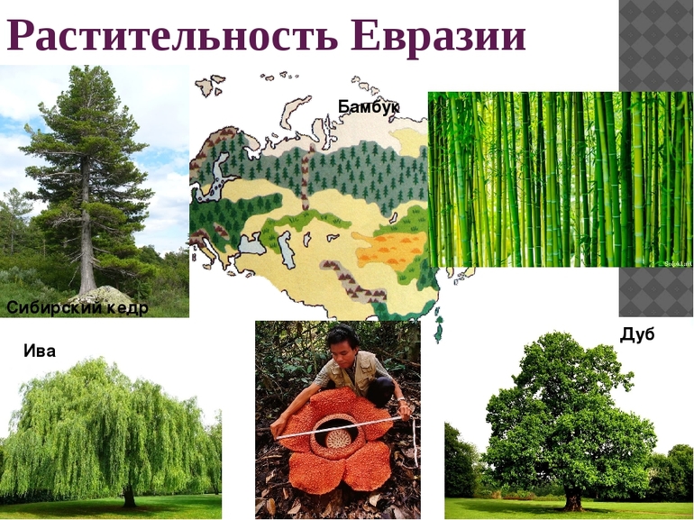 Огромная территория (1/3 от общей суши), на которой простирается континент, способствовала значительной концентрации в Евразии списка растений (эндемиков в том числе), птиц, насекомых и зверей. Поскольку материк занимает все климатические и природные зоны, здесь можно увидеть как жаркие пустыни, так и холодные тундры с типичными для них обитателями.