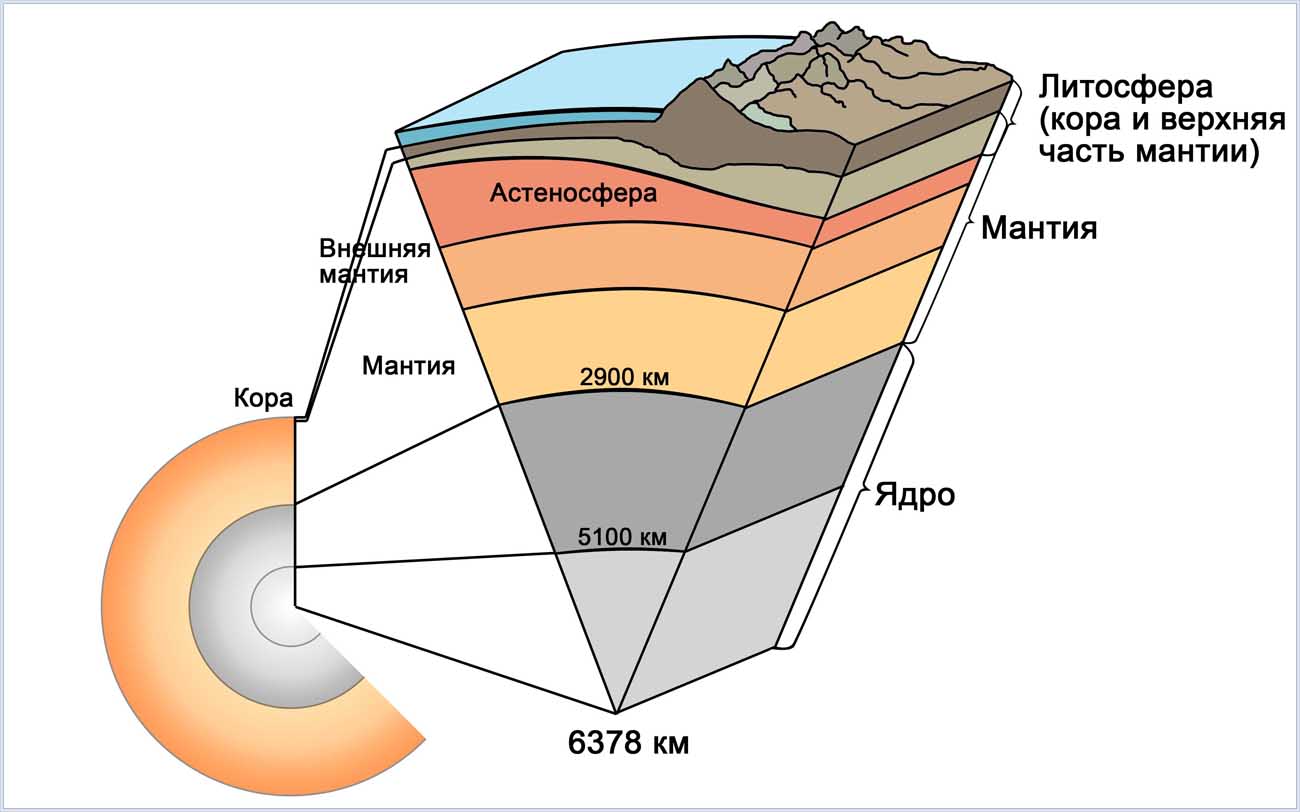 Следующим слоем является литосфера. Он находится над мантией. Его толщина составляет примерно 100 км. Чаще всего литосферу называют земной корой.