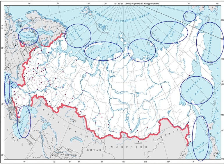 Если посмотреть на карту, можно увидеть, что она пересекает Северно-Ледовитый океан. В восточной части проходит по Тихому океану. На юге — по бескрайним степям и лесам. На западе — по Восточноевропейской равнине.