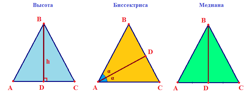 Очень часто при решении заданий необходимо делать дополнительные построения. Треугольник не является исключением. В нем можно провести высоту, медиану и биссектрису. Каждая из этих линий считается отрезком, хотя их можно и продлить при необходимости.