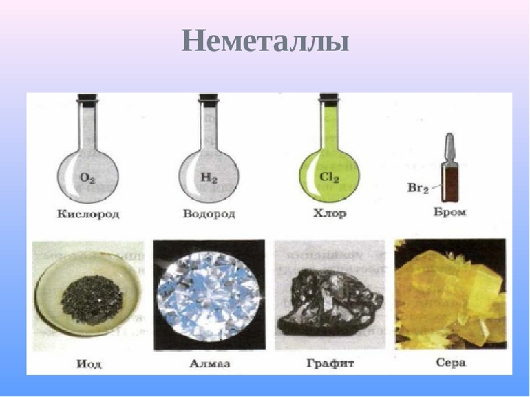 Химические элементы с типично неметаллическими свойствами могут пребывать в разных агрегатных состояниях. Например, йод, фосфор, серу, углерод можно встретить в виде твёрдых веществ. Жидкостью является только бром. Газообразное состояние характерно для азота, кислорода и фтора.