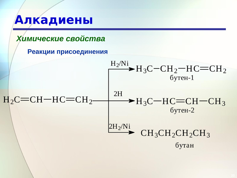 Отличительная черта диенов — наличие двух двойных связей в молекуле. Способы использования и получения алкадиенов, их физические и химические свойства обусловлены этой особенностью.