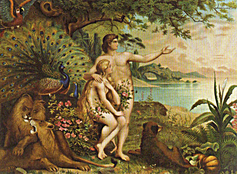 Адам и Ева сча́стливо обитают в райском саду, наслаждаются его плодами, по поручению Бога дают названия животным и растениям. Желая воспитать в первых людях послушание, Создатель произносит одну заповедь: не вкушать с дерева познания добра и зла. Но по наущению дьявола Адам и Ева тайно пробуют плоды и внезапно осознают свою наготу и стыд. Это событие называется «первородный грех», то есть первое преступление Божией заповеди.