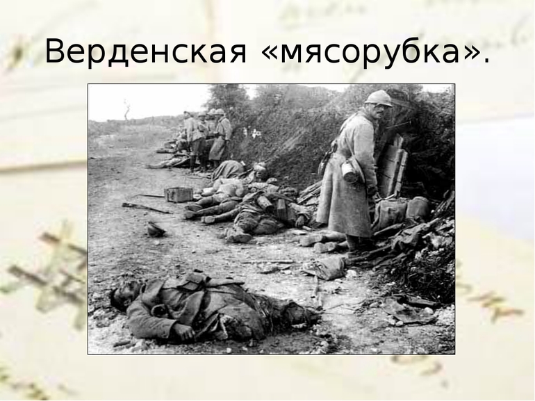 - Мясорубка под Верденом — уродливый феномен Первой мировой войны. Она представляет собой трагический пример войны на истощение, когда обе стороны в результате действий несут громадные потери, но не приобретают какого-либо значительного преимущества над противником.