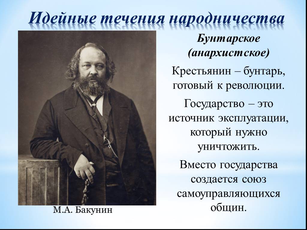 Одним из ключевых деятелей анархистского движения был М. А. Бакунин. Бунтари опирались на мысли Ж. Прудона, который говорил что собственность — это кража. По их мнению, государство является источником деспотизма. Они агитировали народ быть строже и призывали к революции.