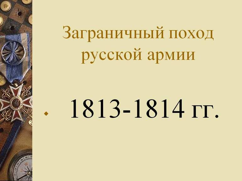 В истории России 1813 год запомнился успехами российской дипломатии и армии. Логическим продолжением Отечественной войны явились заграничные походы русской армии 1813−1814 гг. Они были важны для Российской империи: теперь она воевала не за собственную независимость, а за восстановление в Европе прежних порядков, ослабление Франции и недопущение распространения революционных идей.