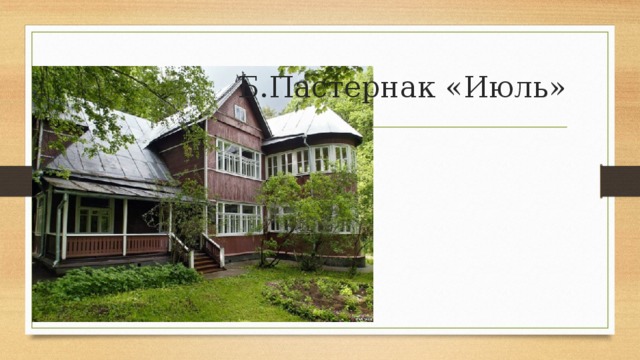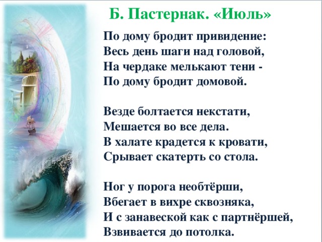 Поэт Борис Леонидович Пастернак (1890—1960) заслуженно считается крупнейшим мастером русского стихосложения середины ХХ века. Его творчество ставится в один ряд с лучшими достижениями мировой литературы. На примере анализа стихотворения Пастернака «Июль» можно раскрыть некоторые его секреты создания ошеломляюще точного, лёгкого и яркого образа самыми простыми и доступными художественными средствами.
