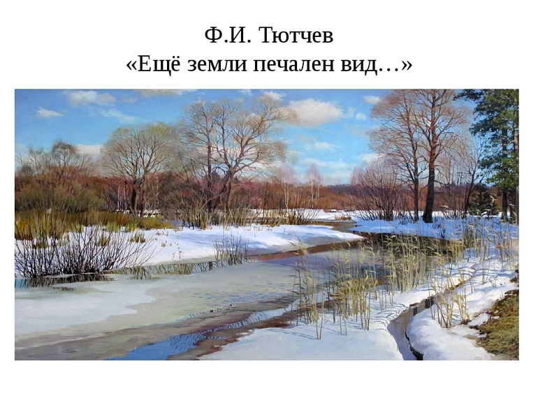Тютчев, будучи восхищённым и влюблённым в природу романтиком, многократно обращался к поэтическим картинкам, к зарисовкам того или иного времени года. Стихотворение «Ещё земли печален вид» о ранней весне, о предчувствии, предвкушении грядущего расцвета всей земли, о пробуждении человеческой души от печального уединения в преддверии новых чувств и отношений.