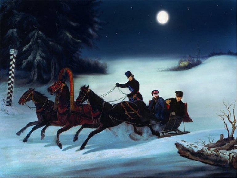 - Композиция. Кольцевая. В первых четырех строфах описаны русская зима, дорога по бескрайним заснеженным просторам. В пятом и шестом четверостишии выражается надежда на скорое соединение с возлюбленной. Последняя строфа похожа на первую — в ней снова упоминается о свете луны.