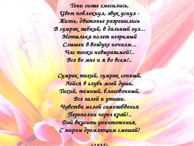 - Второе восьмистишие сделано в форме обращения к сумраку. Здесь много глаголов в повелительном наклонении (лейся, переполни, смешай). Лирический персонаж элегии надеется, что ночная мгла успокоит душу, позволит ей забыться сном и отдохнуть от неотвязных мыслей и глубоких переживаний. Интересно, что, используя глаголы, характерные для описания движения воды, Тютчев как бы сгущает темноту до состояния плотной жидкости, погружает читающего в её душистые волны.