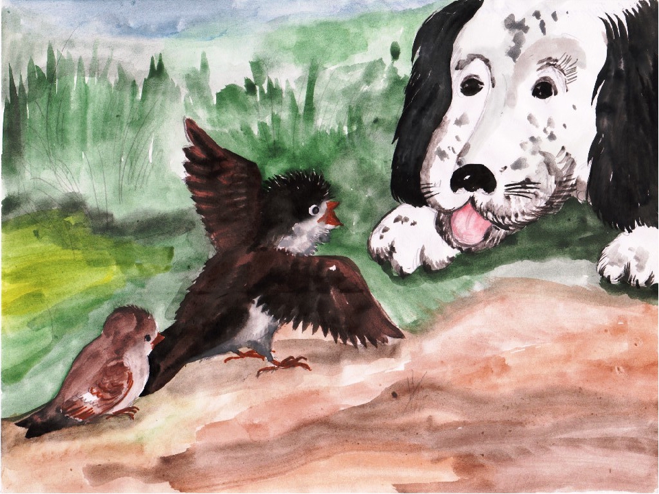 Собака была наготове, но неожиданно перед самым ее носом приземлился другой воробей. Это была взрослая особь, вероятно, родитель птенчика. Птица стала отвлекать Трезора от своего малыша. Старому воробью было страшно, но он все равно продолжал храбро прыгать перед пастью собаки. Такая смелость поразила автора. Скорее всего, пес казался птичке огромным великаном, но родитель был готов пожертвовать собой ради спасения своего птенчика.