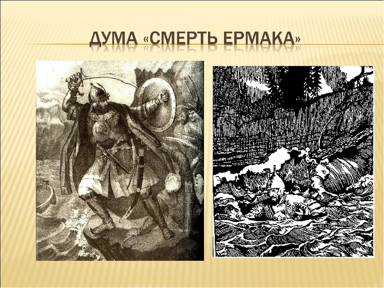 В отряде Ермака были такие же отважные и лихие казаки, как он. Кучум — отрицательный персонаж в думе, подлый, ничтожный и коварный человек.