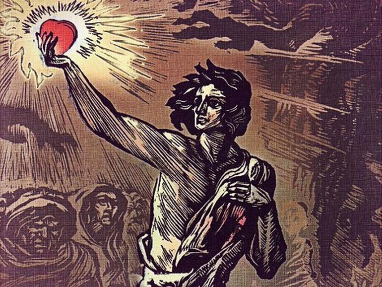 «Что сделаю для людей?!» — перекричал гул деревьев Данко. Племя напугалось, а парень вдруг разорвал свою грудь и вырвал оттуда сердце, потом поднял его над головой. Оно сияло так ярко, что вся тьма рассеялась, а лес замолчал. Очарованные свечением сердца Данко, люди пошли за ним, за светом альтруистического порыва юноши.