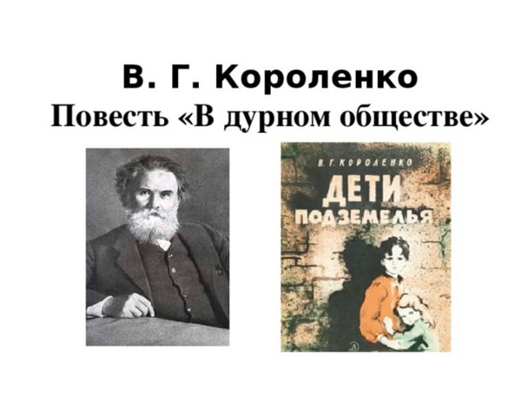 В «В дурном обществе» Короленко рассказывается о сыне местного судьи, который стал дружить с нищими детьми. Мальчик сначала не подозревал, как живут бедные люди, пока не познакомился с Марусей. Писатель учит читателя воспринимать окружающий мир с обратной стороны. Он смог показать, как тяжело переносится одиночество, поэтому необходимо научиться поддерживать нуждающихся.