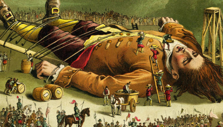 Просыпается путешественник от ощущения скованности и неподвижности. На привязанном к земле теле сидят 40 маленьких человечков. Герой без каких-либо проблем смог смахнуть удивительных людей, но в ответ в великана полетела куча ничтожно мелких стрел.