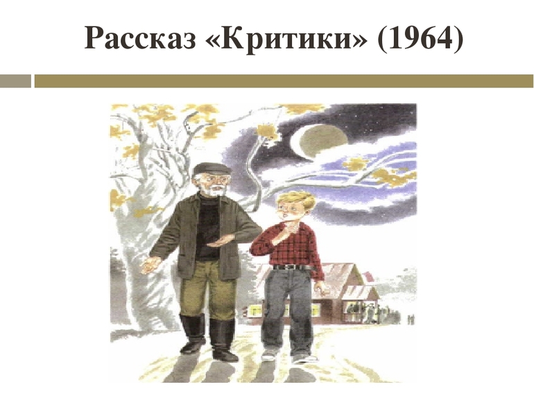 Несмотря на маленький объем рассказа, Василий Шукшин смог удачно описать определенный момент из повседневной жизни старика и его внука. Автор показал их непростые характеры и донес тайный смысл до читателей. Главными героями рассказа «Критики» являются: