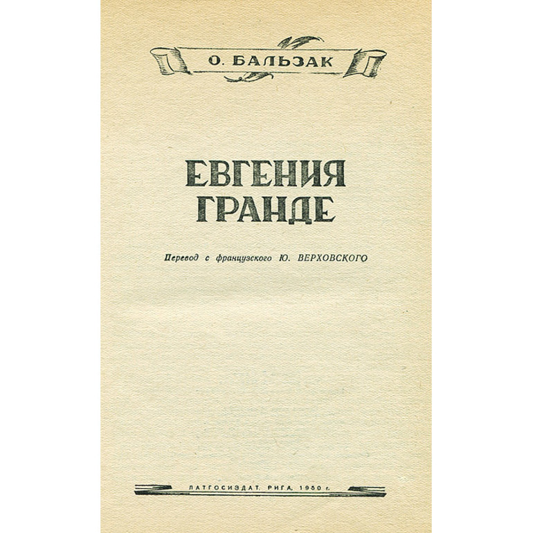 Произведение рассказывает историю семьи Гранде. Ее глава обычный провинциальный буржуа, жесткий и расчетливый делец. Он миллионер, но это не мешает ему быть скупцом. У него есть единственная дочь — Евгения (Эжени в переводе Мандельштама). Она красивая и обаятельная. Несмотря на отца, ее больше привлекают чувства, а не деньги. У Евгений есть кузен — Шарль, красивый юноша и пижон.