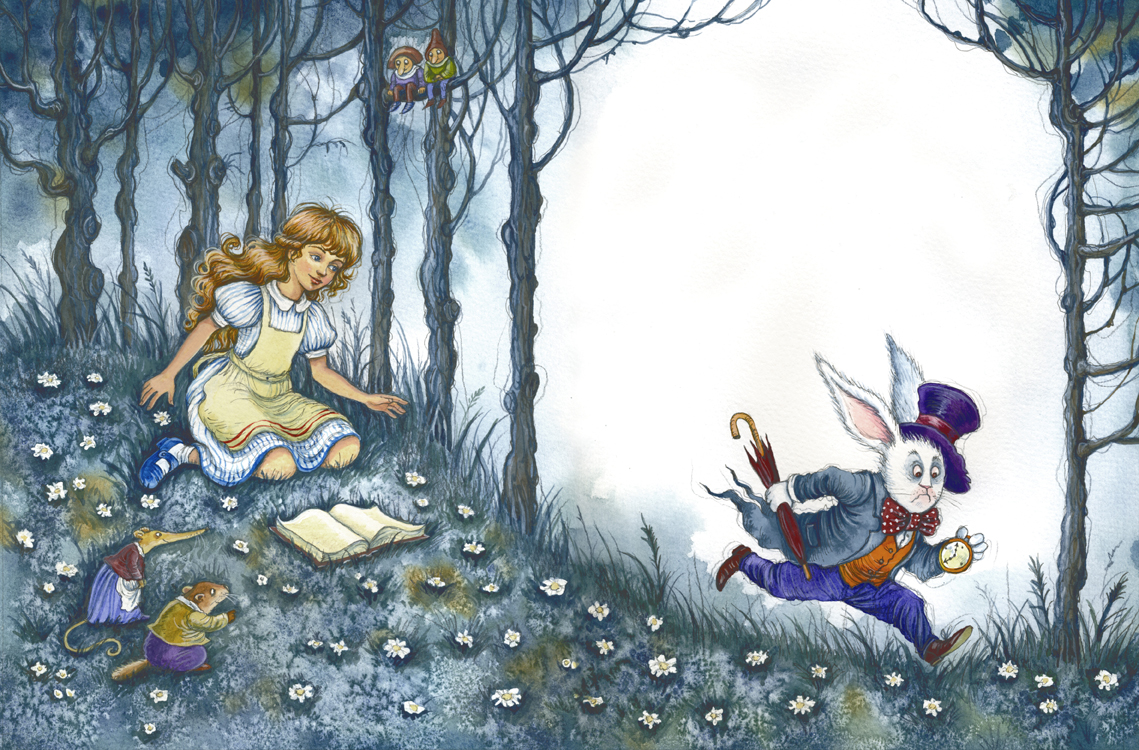 Алиса не знала, чем себя занять, ведь летний день оказался крайне жарким, из-за этого ребёнка клонило в сон. Взгляд малышки остановился на белом кролике, который всем своим видом показывал, что куда-то спешит. Даже то, что животное было в маленькой жилетке с кармашками и часами, и разговаривало, никак не смутило девочку.