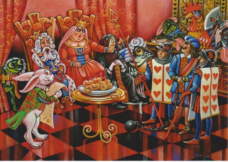 Ребёнок резко встал и случайно опрокинул присяжных, совершенно забыв, что стал значительно выше и крупнее. Королева в ужасе приказала отрубить нахалке голову, послав к ней стражу. Карты-слуги резко взлетели в воздух и понеслись Алисе в лицо, не вызывая у неё испуга. Она начала отбиваться, но неожиданно проснулась на той самой поляне, где прилегла.