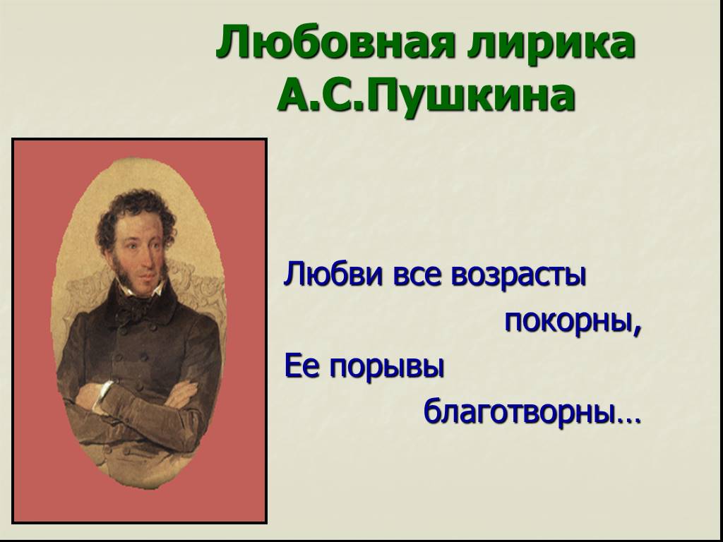Стихотворений о любви у автора более сотни, если учитывать его раннее творчество (лицейские годы). Пушкин верил в любовь, для него она была вечной, пронизывала его жизнь и стихотворения. При этом поэт не ставит ограничений на безоговорочной верности и пожизненной привязанности к одному человеку. Он показывает, что после одной нежной и настоящей любви может прийти вторая, третья. И каждый раз она открывается с новой стороны. Даже безответная любовь в его своеобразии и интерпретации — это путь к осознанию себя, своих ошибок.